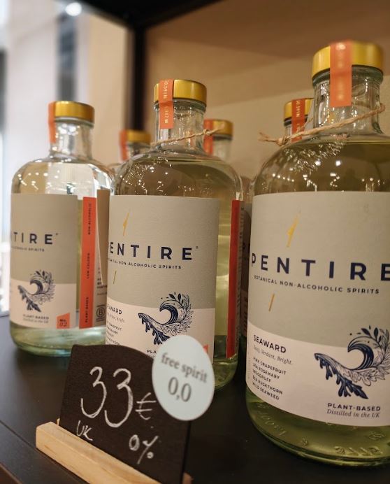 Ylellisen näköisen myymälän hyllyt notkuvat kuohuviinipulloja ja spirittejä, eli alkoholittomia ginejä, viskejä, rommeja ja likööreitä.