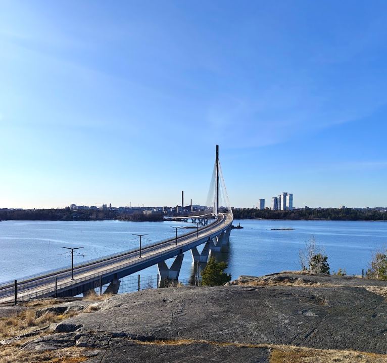 Kruunuvuorenrannasta korkeilta kallioilla löytyy merelle ja Kruunuvuorensillalle avautuva näköalapaikka.