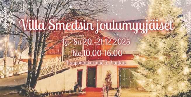 Perinteiset Wanhan ajan joulumyyjäiset Villa Smedsissä lauantaina ja sunnuntaina 20.-21.12.2025 klo 10.00-16.00. Villa Smeds sijaitsee Vantaanlaaksossa Osoitteessa kauppalaivurintie 5, Vantaa.