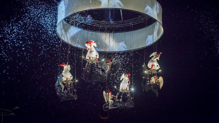 Helsingin juhlaviikkojen tuottaja Sari Löytynoja kertoo kyseessä olevan Suomessa ennennäkemätön akrobaattiteos, jossa esiintyjät nousevat jopa 60 metrin korkeuteen. Näyttävä teos sopii kuitenkin koko perheelle. Teosta voi katsella Senaatintorilla ja myös kirkon ylätasanteella. Kirkon portaat on varattu esitystilaksi.