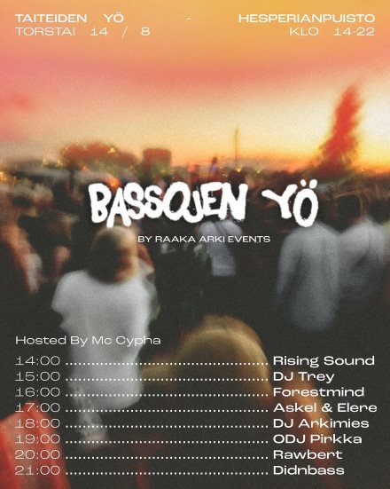 Syvää bassoa ja sykettä kaupungin ytimessä! Bassojen yö tuo Drum & Bass -musiikin voiman stadilaisten koettavaksi Taiteiden yönä Hesperianpuistossa. Illan aikana kuullaan dnb:tä ja junglea laidasta laitaan. Tule mukaan nauttimaan vapaasta tunnelmasta, rytmistä ja kaupungin kesästä!