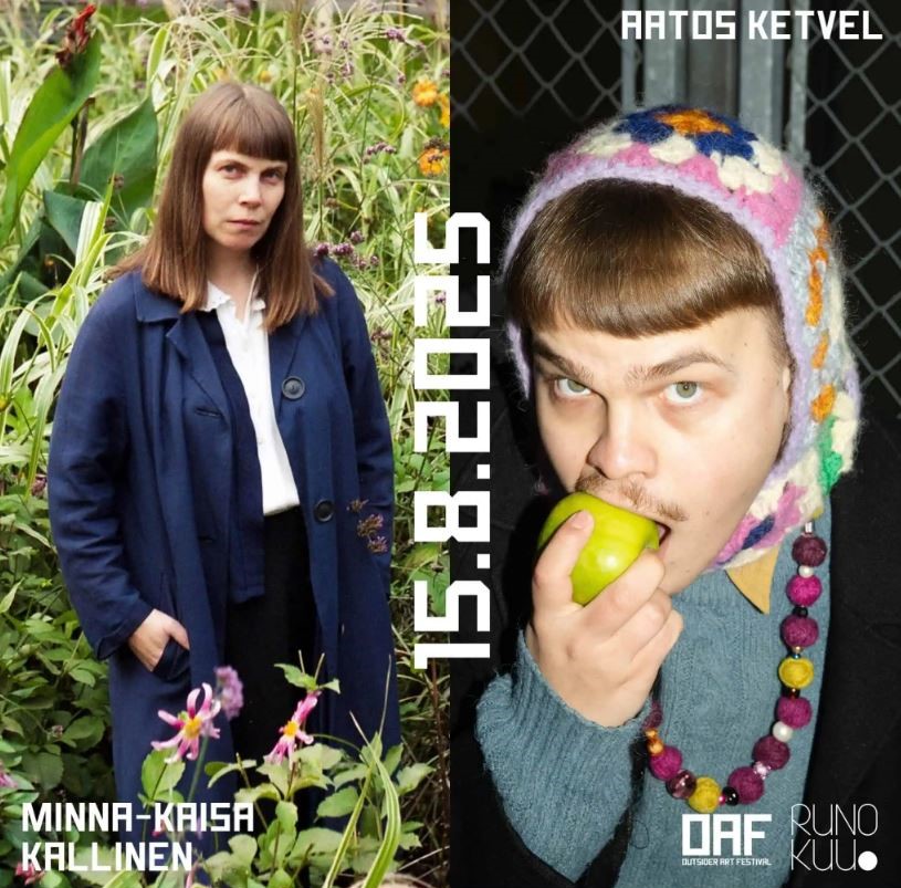 Outsider Art Festival ja Runokuu järjestävät yhteisen keskustelun Tekstin talon Permantosalissa perjantaina 15.8.2025 klo 17.30-18.30.
