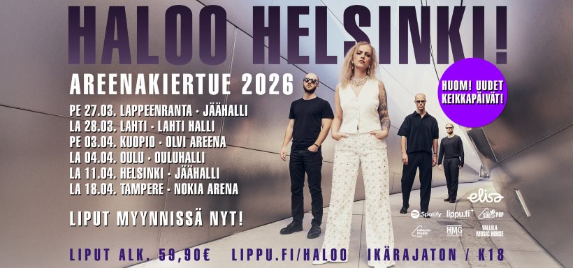 “Uusi Haloo Helsinki! -albumi “Voiko enkelitkin eksyä” julkaistaan 10. lokakuuta 2025. Levyn julkaisun myötä meillä on suuri ilo ja kunnia lähteä mittavalle Areenakiertueelle keväällä 2026. Lupaamme soittaa teille uusia biisejä ja vanhoja hittejä, mutta myös pari ylläriäkin on luvassa! Tulkaa jengi mestoille, niin pidetään kunnon bileet!” –yhtye kuvailee tulevaa kiertuetta