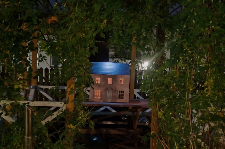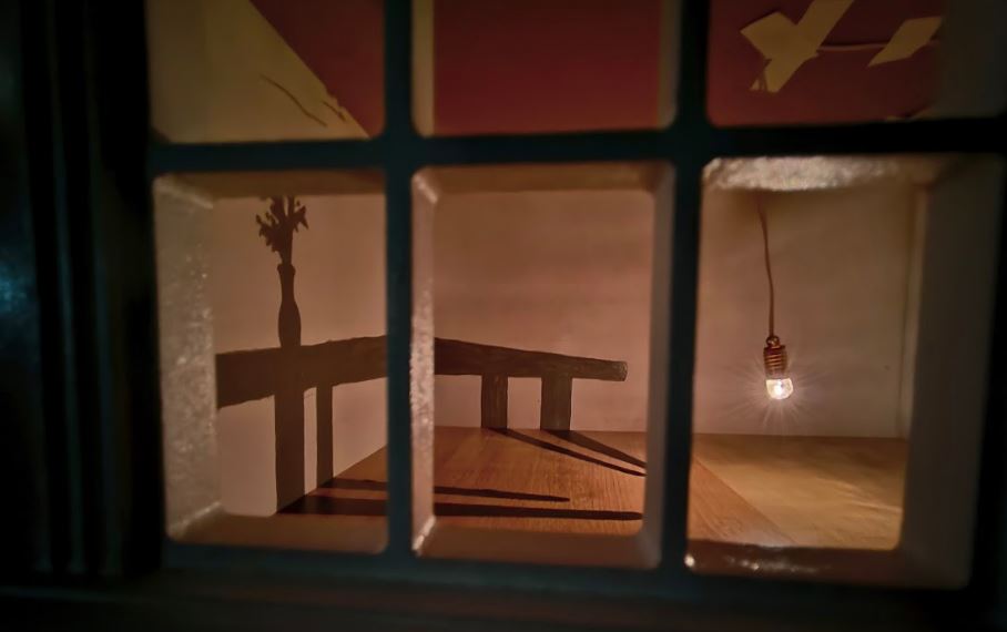 Teosta katsellaan nukketalon pikkuruisista ikkunoista.