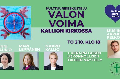Valon voima -keskustelu kulttuurista, taiteesta ja siitä mikä ylläpitää toivoa varjoisina aikoina. Keskustelemassa ajankohtaisesta teemasta torstaina 2.10.2025 klo 18 Kallion kirkossa ovat tohtori Jenni Haukio, piispa Mari Leppänen ja kouluttajapsykoterapeutti Maaret Kallio. Ohjelmassa on myös näyttelijä Hannu-Pekka Björkmanilta kulttuurivaikuttajan puheenvuoro ja illan musiikista vastaavat oopperalaulaja Aarne Pelkonen ja kanttori Tommi Niskala.