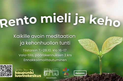 Briefly in English: Rento mieli ja keho is a free and simple meditation and body care class that’s open for everyone. The instruction is in Finnish, but feel free to join if you understand Finnish. There is pre-registration for all the classes. You can find the events on our website: https://lapinlahdenlahde.fi/tapahtumat/