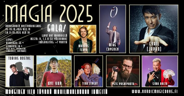 Magia 2025 tuo Hanasaaren lavalle kansainväliset huipputaikurit ja kotimaiset silmänkäännön mestarit vuoden maagisimpaan show’hun. Luvassa on häikäiseviä taikatemppuja, hämmästyttävää mentalismia, nokkelaa huumoria ja henkeäsalpaavaa taituruutta maailman huipulta – ohjelmaa, joka saa sinut epäilemään omia silmiäsi.