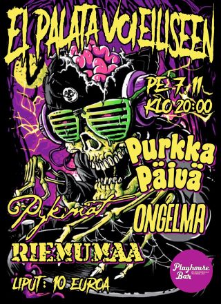 Purkkapäivä on tamperelainen pop-punk-bändi, joka kuvailee musiikkiaan kunnianhimottomaksi hedelmäiseksi makusekoitukseksi. Tarttuvat melodiat ja energinen livemeininki viiden hengen keikkakokoonpanon kera menee raskaammankin tossun alle. Uusi levy ilmeistyi juuri!. https://open.spotify.com/artist/4xzKXfWHpwTiWoQt2BH3sL