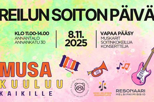 Maksuton koko perheen musiikkitapahtuma Reilun Soiton Päivä järjestetään tänä syksynä Annantalolla (Annankatu 30).