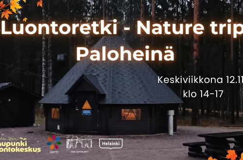 Vietetään yhdessä mukava iltapäivä Paloheinässä ihaillen ja virkistyen loppusyksyn luonnosta! Paloheinän ulkoilualue tarjoaa paljon erilaisia luontoaktiviteetteja osana Keskuspuistoa. Alueella on myös merkittävä 137 hehtaarin Haltialanmetsän luonnonsuojelualue. Retken lopuksi tunnelmoidaan ja grillaillaan Paloheinän kodalla, eli mukaan kannattaa ottaa omaa grillattavaa. Lisäksi voit osallistua kodalla vapaamuotoiseen pajaan, jossa tehdään lankaa nokkosesta ja lehmuksesta! Retki on kaikille avoin ja ilmainen, lankapajaan osallistuville pieni kahden (2€) euron materiaalimaksu käteinen/Mobilepay.