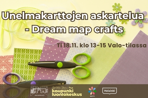Come and make a dream map in the cozy Valo-tila at Lapinlahden Lähde. You can use magazines, colorful cardboard, and other decorations. Let’s marvel at different pictures, words, and colors together! The workshop is open to everyone and free of charge. If you wish, you can support our activities with a small material fee on the spot. The workshop will be open on Tuesday, November 18th, from 1:00 p.m. to 3:00 p.m. on a non-stop basis, and no registration is required, except for bigger groups, which are kindly requested to inquire in advance at kaupunkiluontokeskus@lapinlahdenlahde.fi. The workshop can accommodate a maximum of 14 people at a time.