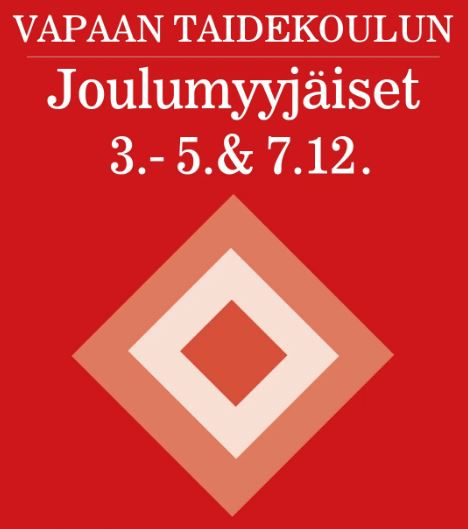 Vapaan taidekoulun perinteisissä joulumyyjäisissä myydään eri vuosikurssien opiskelijoiden taidetta. Kaikki tuotot menevät taiteilijoille eli koulun opiskelijoille. Mieleisen työn kohdatessa ostat sen helposti heti mukaan itsellesi tai persoonallisena lahjana pukinkonttiin.