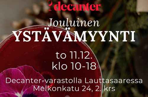 Decanterin suosittu joulun ystävämyynti tulee taas! Tarjolla on jälleen laaja kattaus viini- ja keittiötarvikkeita erinomaisin hinnoin, jopa 70 % alennuksilla! Tule tekemään huikeita löytöjä pukinkonttiin torstaina 11.12. Decanterin varastolle Lauttasaareen!🎄