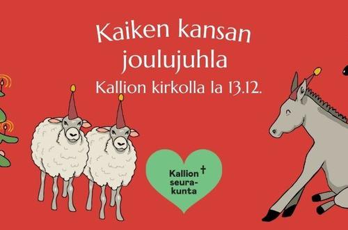 Lämpimästi tervetuloa lauantaina 13.12. klo 11–13 Kaiken kansan joulujuhlaan Kallion kirkon pihalle ja kirkkoon. Tervetuloa tapaamaan oikeita lampaita ja aaseja, nauttimaan tunnelmasta, äänestämään kauneinta joulukuusta sekä seuraamaan seiminäytelmää. Eläimet ovat paikalla klo 13 asti.