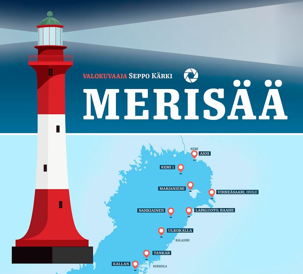 Merisää -valokuvanäyttely Sanomatalossa. Esillä ovat kaikki YLE Radion Merisää -ohjelmassa kuultavat 38 rannikkohavaintoasemaa. Mukana myös Kotka Rankki ja Nahkiainen.