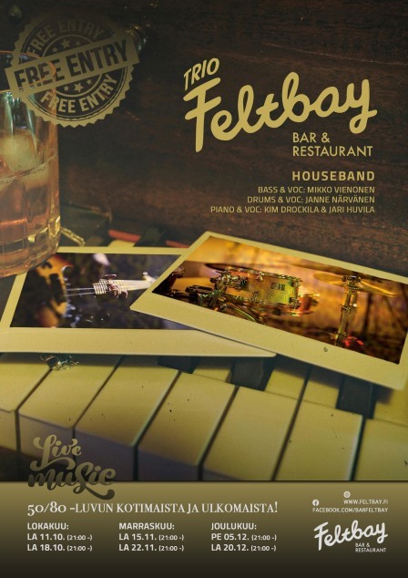 Trio Felbay esiintyy kahtena lauantaina kuukaudessa. Musiikki alkaa aina klo 21:00.