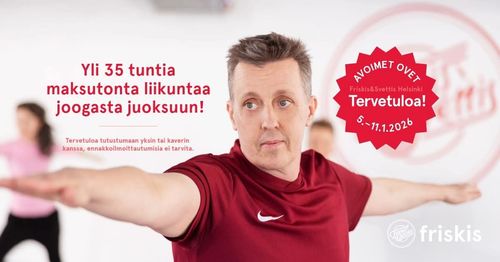 Avoimien ovien viikolla 5.1.-11.1.2026 kaikille Friskis Helsingin sisäliikuntatunneille on vapaa pääsy. Tarjolla on kivaa seuraa ja monipuolista liikuntaa joogasta voimaharjoitteluun eri puolilla Helsinkiä. Lisäksi ulkoliikunnan ollessa vielä tuon viikon tauolla, ulkoliikuntaan on avoimet ovet viikolla 3, eli 12.-18.1.2026! Myös Crusellin peruskoululla on avoimet ovet poikkeuksellisesti viikolla 3.