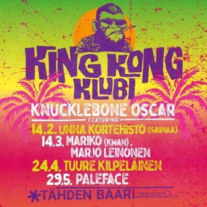 Knucklebone Oscarin KING KONG KLUBI tuo kerran kuussa nimekkäitä artisteja viihdyttämään Konepajan uuteen Tähden baariin.