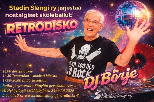 Lauantaina 11.4.2026 klo 16-20 Käpylän peruskoulussa ex. Hykkylässä (Mäkelänkatu 89, Käpylä) Skolebailut – Retrodisko.