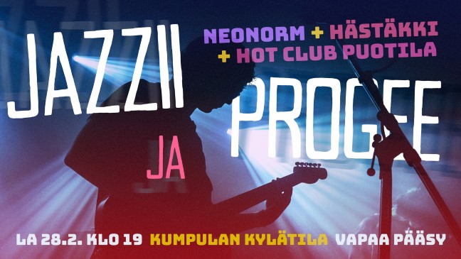 Jazzia ja Progea ei ole koskaan liikaa! Kumpulan Kylätilassa kajahtaa mahtava teemailta kolmen väkevän bändin voimin: Neonorm, Hästäkki ja Hot Club Puotila. Vapaa pääsy, oma pullo mukaan – ja keittiön Buffasta huikopalaa pikkurahalla. Let’s go!