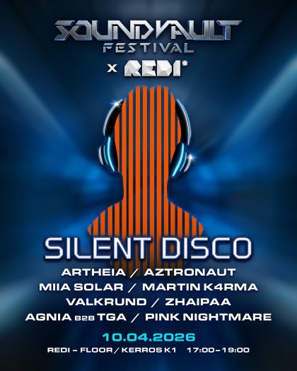 Silent Disco -tapahtuma pidetään Redin K1-kerroksessa perjantaina 10.4.2026 kello 17–19. Disco juhlistaa naapurissa Suvilahdessa toukokuun lopulla vietettävää SoundVault -festivaalia.