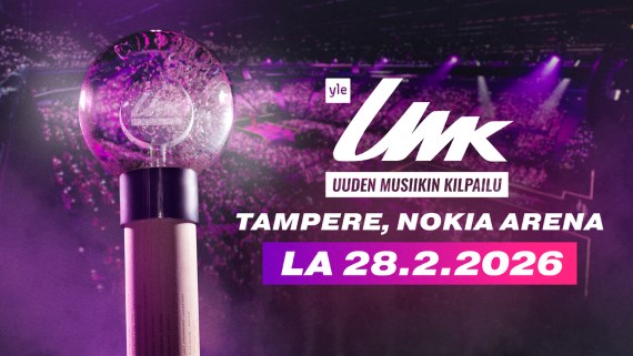 Uuden Musiikin Kilpailu Tampereen Nokia Areenalla lauantaina 28.2.2026 kello 21 alkaen. Finaalia voi seurata UMK:n näyttävissä ravintoloissa, Yle Areenassa ja TV1:llä