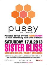 Juhlavuoden päätapahtuma La 17.8.2013 on silkkaa tyttöenergiaa ja levyjä pyöritetaan nais dj´n voimin. Pussy Clubin oma kaunotar Milla Lehto, lisäksi vieraaksi saapuvat maailmankuulu hunajainen Sister Bliss (Faithless) sekä tuottajana/säveltäjänäkin tunnettu Katerina ja sokerina pohjalla kesän kuumin mimmiartisti Sini Sabotage! Power Pussy Girls!