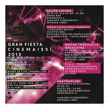 Latinot tietävät miten elämästä otetaan ilo irti - tänäkin vuonna Latinalaisen Amerikan elokuvafestivaali Cinemaissí järjestää kaupungin parhaat bileet! Viime vuonna tila loppui kesken, nyt juhlia varten on varattu jättimäinen Le Bonk!
