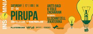 Insomniacs avaa kesäkauden tuomalla italialaistuottaja Pirupan vierailulle Venuelle. Mies on lyhyessä ajassa vakiinnuttanut paikkansa tech house -maailman huipulla. Viimeksi Pirupa villitsi suomalaisyleisön vuonna 2012 ja herran suosio on kasvanut viimeisen parin vuoden aikana räjähdysmäisesti. Pääsalin aloitus- ja lopetusseteistä vastaavat Insomniacseista tuttuun tapaan illan vakiokasvot Illschnitzell & Jekaterina.