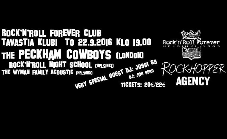 Rock'n'roll Forever Club: The Peckham Cowboys (Uk/fin), Rock'n'roll Night School, The Wyman Family, to 22.9.