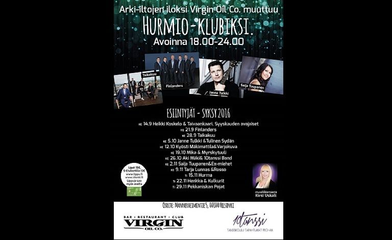 Arki-iltojen iloksi 14.9.2016 alkaen Virgin Oil Co. muuttuu jälleen Hurmio-klubiksi. Pääosassa kuuma paritanssiparketti klo 18-24, jossa LIVE-musiikin tahdeissa kaikki viihtyvät!