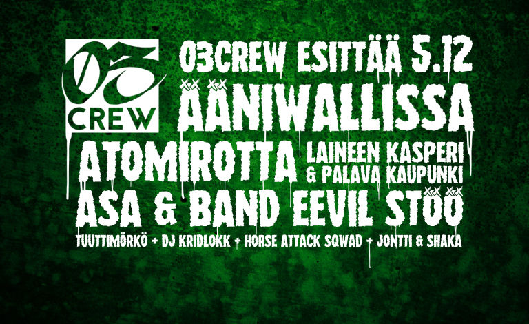 Tampereen rytmimusiikkikentän henkiin herättänyt tuotantokollektiivi 03Crew järjestää kotitontillaan 30-40 rap- ja rytmimusiikin tapahtumaa vuosittain. Itsenäisyyspäivän kynnyksellä joulukuun 5. 2016 03Crew avaa pelin Helsingin Ääniwallissa häkellyttävällä, kotimaisen räpin eri kärkisuuntaukset yhdistävällä lineupilla.