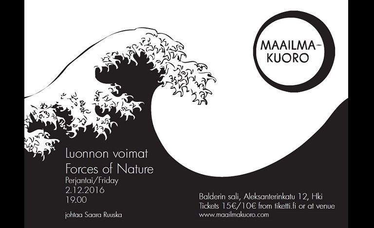 Maailma-kuoron kaamoskonsertti hehkuu puhdasta musiikin energiaa! Luonnon voimat - Forces of Nature -konsertissa tutkitaan ihmisen ja luonnon suhdetta sekä juurien ja ympäristön vaikutusta elämän kulkuun. Joskus luonnosta saa voimaa; joskus luonnon voimia ei voi hallita ja ne johtavat tragedioihin. Musiikista voi saada myös lohtua, ja Maailma-kuoron Luonnon voimat -konsertti energisoi ja tuo valoa pimeimpään vuodenaikaan. Konsertissa kuullaan niin kansanmusiikkia kuin sävellettyäkin musiikkia Suomesta sekä mm. Etelä-Amerikasta, Itä-Euroopasta sekä Beninistä. Konsertissa kuullaan kantaesityksenä Olli Moilasen Pilvet sekä Saara Ruuskan Maa Elementit-sarjasta naiskuorolle.