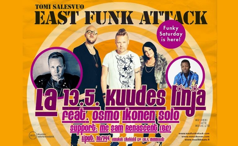 Tomi Salesvuo East Funk Attack valtaa Kuudes linja -klubin lauantaina 13.5. Erikoisillan kiihkeä funk-poljento on taattua, kun lavalla funkkaa rumpali Salesvuon johdolla liuta Suomen kärkikaartin muusikoita kitaristi Marzi Nymanista laulaja Anniina Karjalaiseen. Illan solistivieras on aina häikäisevän energinen Osmo Ikonen ja omalla setillään illan aloittaa bändin ulkomaan vahvistus MC Sam Renascent (BE). Viime syksynä toisen albuminsa "Rhythm" julkaisseen Tomi Salesvuo East Funk Attack bändin biiseissä on tarttumapintaa niin rock- kuin jazz-musiikin diggareille ja vahvaan funkpoljentoon nojaava meno sytyttää bileet! Kutosen Funk lauantaissa on luvassa iso kattaus rytmimusaa eikä yllätyksiltäkään säästytä!