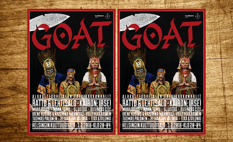 Kokeellisen psykedelian mestari, ruotsalainen Goat saapuu ensimmäiselle klubikeikalleen Suomeen Helsingin Kulttuuritalon Aalto-salin lavalle 3.2.2018. Näissä Alakulttuuritalon Talvibakkanaaleissa on dotettavissa hengästyttäviä rytmejä, stonerjumitusta, psykedeliaa, outoja asuja ja tanssivaa yleisöä. Lavan Goatille lämmittelee Rättö ja Lehtisalo, eli Circlen komentaja Jussi Lehtisalon ja Kuusumun Profeetan visionääri Mika Rätön projektiluontoiseksi kuvattu yhtye.