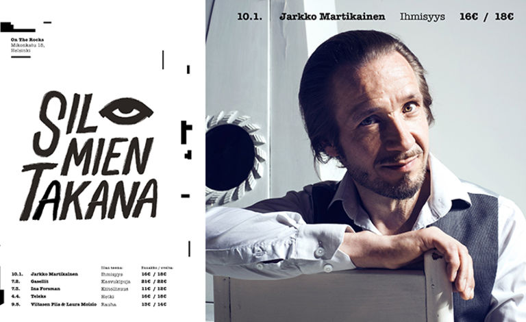 Menestyksekkäästi On the Rocksissa syksyllä alkanut Silmien Takana -klubi jatkuu keväällä viiden torstai-illan kattauksella. Kuukausittain vaihtuviin teemoihin, haastatteluosioon ja riisuttuihin esityksiin perustuvan klubin kantava ajatus on syventyä eturivin artistien tuotantoon tietystä näkökulmasta. Artistit räätälöivät klubia varten teemaa myötäilevän settilistan, mikä erottaa keikan normaalista klubivedosta. On the Rocks muutetaan Silmien Takana -iltojen ajaksi intiimiksi keikkatilaksi, ja tarkoitus on luoda kiireetön ja rauhallinen ilmapiiri. Jokaiselle keikalle myydään rajallinen määrä lippuja, jotta tila ei käy liian ahtaaksi ja suurin osa yleisöstä pääsee istumaan. Tammikuun esiintyjänä Jarkko Martikainen!