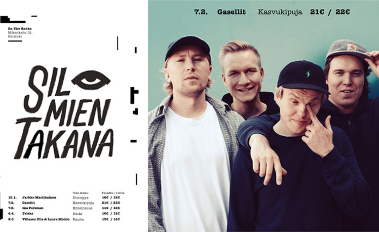 Menestyksekkäästi On the Rocksissa syksyllä alkanut Silmien Takana -klubi jatkuu keväällä viiden torstai-illan kattauksella. Kuukausittain vaihtuviin teemoihin, haastatteluosioon ja riisuttuihin esityksiin perustuvan klubin kantava ajatus on syventyä eturivin artistien tuotantoon tietystä näkökulmasta. Artistit räätälöivät klubia varten teemaa myötäilevän settilistan, mikä erottaa keikan normaalista klubivedosta. On the Rocks muutetaan Silmien Takana -iltojen ajaksi intiimiksi keikkatilaksi, ja tarkoitus on luoda kiireetön ja rauhallinen ilmapiiri. Jokaiselle keikalle myydään rajallinen määrä lippuja, jotta tila ei käy liian ahtaaksi ja suurin osa yleisöstä pääsee istumaan. Helmikuun esiintyjänä Gasellit!