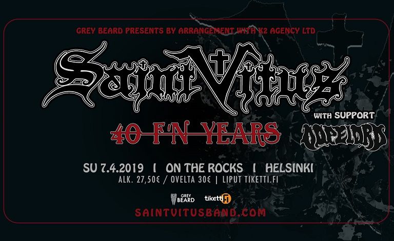 Doom metallin kummisetäbändi Saint Vitus saapuu On The Rocksiin sunnuntaina 7. huhtikuuta osana "40 F'N Years" -kiertuettaan. Vuonna 1979 Los Angelesissa perustettu yhtye edustaa doom metallin ensimmäistä aaltoa Pentagramin, Witchfinder Generalin, Troublen ja Pagan Altarin ohella. Saint Vitusin soundin suurimpia vaikuttimia on Black Sabbath, jonka "St.Vitus Dance" -kappaleesta bändi on nimensäkin napannut. Ensialbumi näki päivänvalon (tai ehkä ennemmin yön pimeyden?) vuonna 1984 ja yhdeksäs täyspitkä studiotuotos on tulossa vuonna 2019 Seasons Of Mistin toimesta.