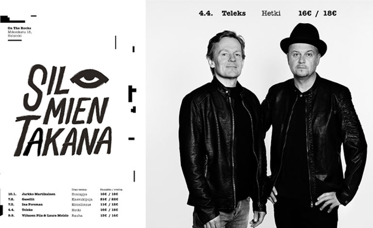 Menestyksekkäästi On the Rocksissa syksyllä alkanut Silmien Takana -klubi jatkuu keväällä viiden torstai-illan kattauksella. Kuukausittain vaihtuviin teemoihin, haastatteluosioon ja riisuttuihin esityksiin perustuvan klubin kantava ajatus on syventyä eturivin artistien tuotantoon tietystä näkökulmasta. Artistit räätälöivät klubia varten teemaa myötäilevän settilistan, mikä erottaa keikan normaalista klubivedosta. On the Rocks muutetaan Silmien Takana -iltojen ajaksi intiimiksi keikkatilaksi, ja tarkoitus on luoda kiireetön ja rauhallinen ilmapiiri. Jokaiselle keikalle myydään rajallinen määrä lippuja, jotta tila ei käy liian ahtaaksi ja suurin osa yleisöstä pääsee istumaan. Huhtikuun esiintyjänä Teleks!