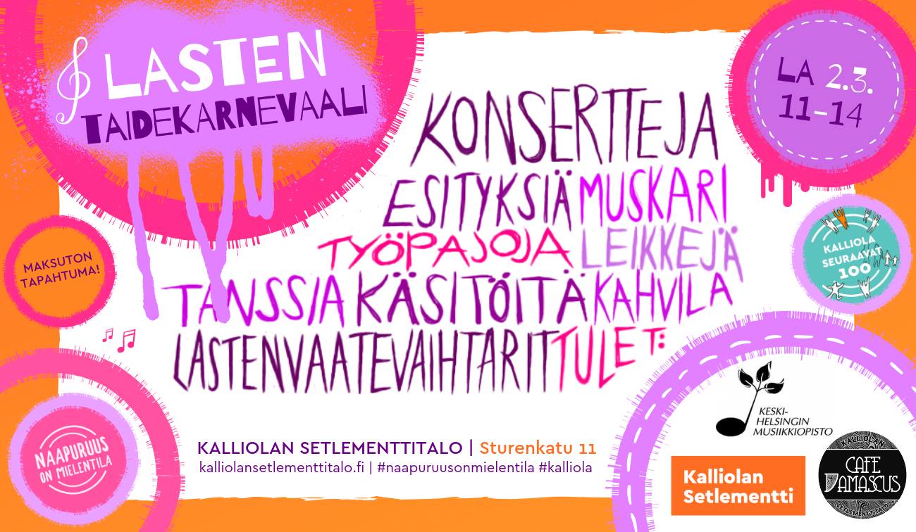 Maaliskuun ensimmäisenä lauantaina vietetään Kalliolan setlementtitalolla nyt toista kertaa lasten ja lapsiperheiden omaa kulttuurikarnevaalia! Karnevaalien ajaksi setlementtitalo täyttyy lapsiperheitä hellivistä konserteista, tanssi- ja kädentaitojen työpajoista, musiikkituokioista, muskarista ja leikeistä. Lisäksi ohjelmassa erilaisia esityksiä ja lastenvaatevaihtarit. Ja mikä parasta - koko ohjelma on maksuton. Tervetuloa saamaan elämyksiä ja kulttuurikipinää koko perhe yhdessä! HUOM. Osaan työpajoista mahtuu mukaan vain rajallinen osallistujajoukko. Ennakkoilmoittautumista ja suosittelemme tulemaan paikalle hyvissä ajoin :)