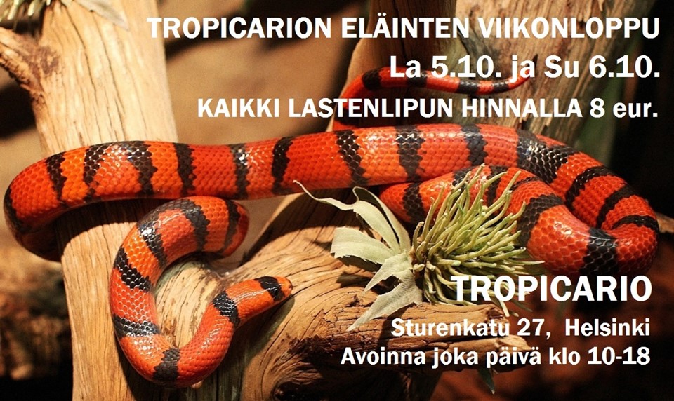 Tropicarion eläinten viikonloppu. Erikoishinta tänä viikonloppuna kansainvälisen eläinten viikon kunniaksi.
