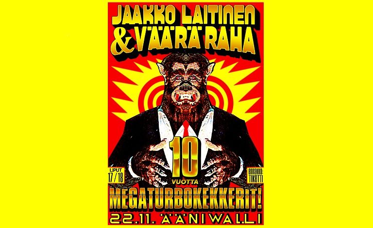 Kymmenvuotista taivaltaan Lapland-Balkan-musiikin kiemuraisissa maailmoissa juhlistava Jaakko Laitinen & Väärä Raha julkaisee marraskuussa 2019 viidennen pitkäsoittolevynsä. Ilman isoja juhlia ei uutta levyä ole tapana maailmalle päästää ja Helsingissä levyä juhlitaankin pitkän kaavan mukaan Ääniwallissa. Väärän Rahan lisäksi luvassa on ulkomaan vierasta ja Balkan-DJ-toimintaa pitkälle yöhön asti. Pääraaka-aineita orkesterin musiikilliseen keikokseen ovat vanhan liiton suomalainen iskelmä ja Balkanin romanirytmit. Maustekaapista löytyy myös vaikutteita Venäjältä, Turkista, Kreikasta ja Gruusiasta. Kaikki leivotaan kasaan lappilaisen charmöörillä tyylillä ja Väärän Rahan maailmanluokan tatsilla. Neljä kriitikoiden ylistämää ja fanien rakastamaa albumia julkaissut yhtye tunnetaan erityisesti hurmoksellisena live-bändinä, jota mainetta orkesteri onkin pitänyt yllä 70 keikan vuositahdilla. Eirasta Inariin hurmannut orkesteri on vieraillut kauniin ja karun kotimaamme rajojen ulkopuolella jo yli 20 maassa.