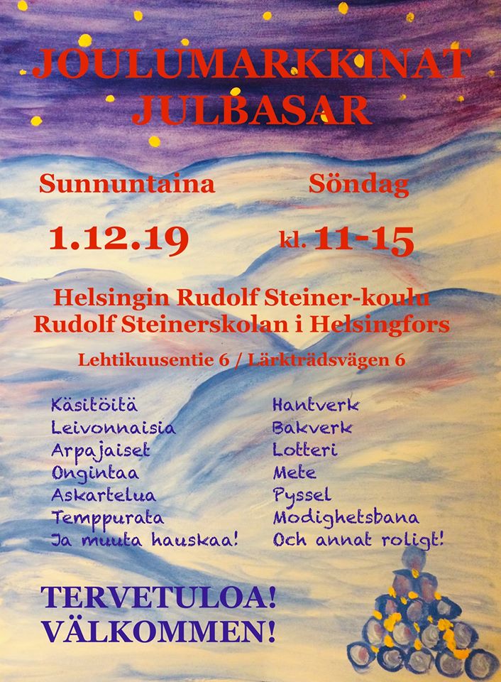 Rudolf Steinerskolans traditionella julmarknad ordnas söndagen 1.12.2019 kl. 11-15 på Lärkträdsvägen 6 i Helsingfors. Kom och njut av hemlagade bak- och hantverk, julgröt, glögg, våfflor, korv, delikatesser från kaféet och ponnyridning för familjens minsta om vädret tillåter. Dessutom lyckohjul, lotterier och glad julstämning. Välkomna!