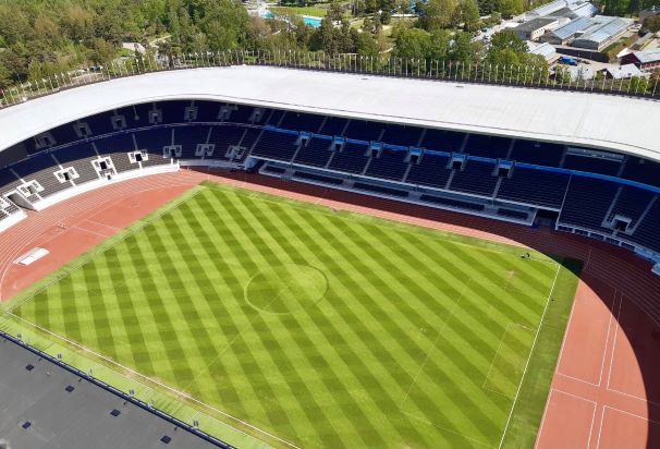 Olympiastadionin nurmi upeasti leikattuna, valmiina ottamaan Huuhkajat vastaan.