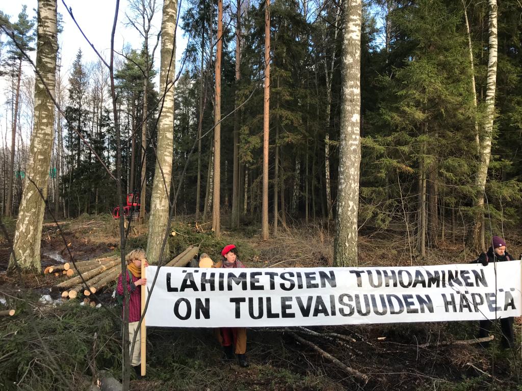 Kivikossa on käynnissä Luonto-liiton aktiivien mielenilmaus metsähakkuu-alueella Kivikonlaidassa. Helsingin kaupunki hakkaa metsää alueelta hehtaarin kokoisen maa-ainesten kierrätyskentän sekä kentälle johtavan väylän tieltä.